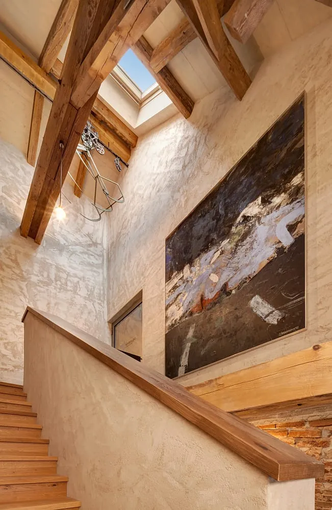 Der alte Heukran schwebt als Zeitzeuge über dem Treppenhaus.