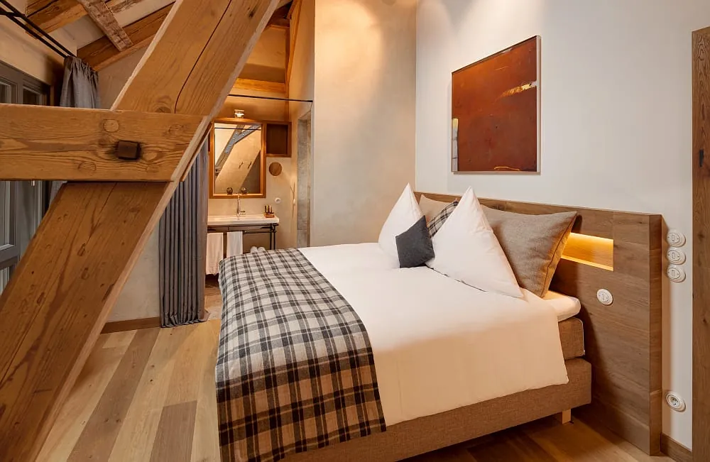 Zum außergewöhnlichen Ambiente des Hotels tragen auch die vom Putz befreiten Natursteinmauern bei, die zwar im Kontrast zum dekorativen Holzgebälk stehen, den acht Zimmern aber zusätzlichen Charme verleihen. Dem Architektenpaar Ber­schneider war es wichtig, die Spuren der Vergangenheit nicht zu beseitigen, sondern in das Ensemble sowohl gestalterisch als auch funktional zu integrieren. Alte Futtertröge finden sich als Dekoration in den Zimmern, ein Heukran schwebt über dem Treppenhaus und Gusseisenteile wurden zu Griffen an den Einbaumöbeln.