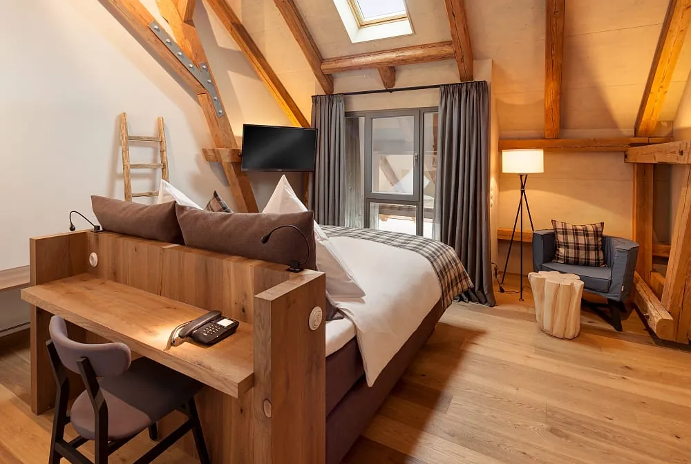 Der von Zimmerer- und Dachdeckermeister Martin Blomenhofer in dritter Generation geführte Betrieb sorgte dafür, dass das ursprünglich handgeschlagene Gebälk nicht nur saniert und weitgehend erhalten werden konnte, sondern dass der Holzbau als sichtbares Element dem neuen Vier-Sterne-Hotel seinen unverwechselbaren Charme verleiht.