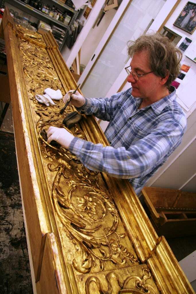Deswegen bearbeitet Vergolder Brian Auspitz so das Gold am neuen Rahmen, dass es wie ein 500 Jahre alter Anstrich wirkt. - © Geimer