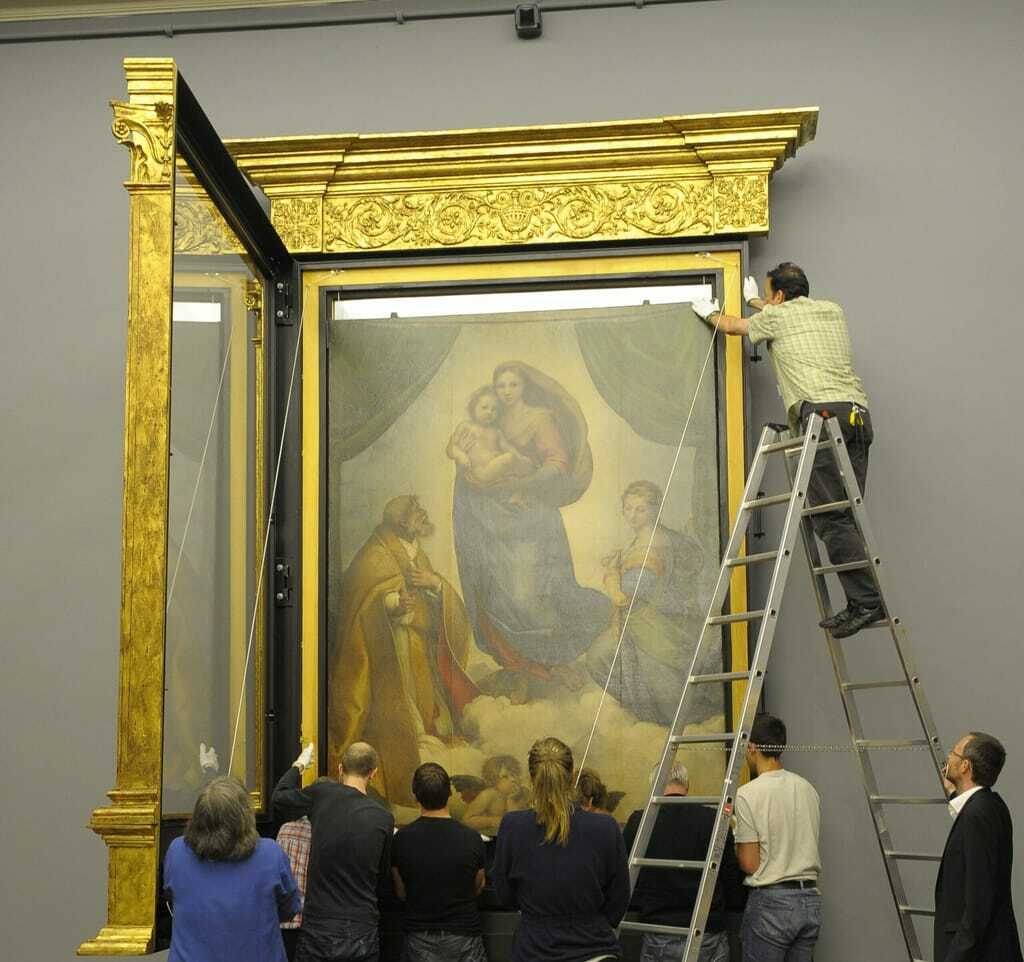Museumsmitarbeiter richten die Sixtinische Madonna für die neue Ausstellung zu ihrem 500. Geburtstag her. - © Matthias Rietschel/dapd