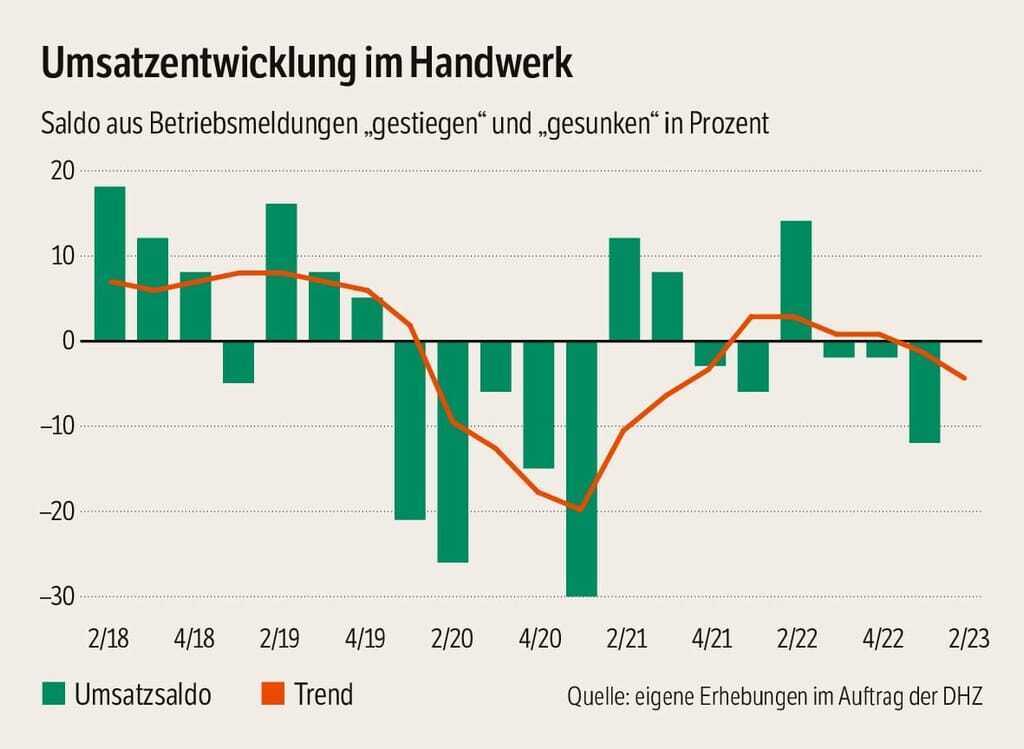 Die verfestigte Inflation und die von der Europäischen Zentralbank als Gegenmittel verfügten Zinserhöhungen lasten schwer auf der deutschen Wirtschaft. Sowohl die Brieftaschen der Verbraucher als auch die Investitionsbudgets der Unternehmen haben an Kaufkraft verloren. Das Handwerk bekommt die Zurückhaltung seiner Kunden zu spüren. Im ersten Quartal 2023 – weiter reichen die amtlichen Daten nicht – gingen die Umsätze zwar nominal um 9,8 Prozent über das Vorjahresniveau hinaus. Nach Abzug der Preissteigerung schlägt das Vorzeichen jedoch um; die DHZ schätzt den realen Rückgang auf zwei Prozent. Es verwundert also nicht, dass die Zahl der tätigen Personen Ende März um 1,2 Prozent unter dem Vorjahreswert lag. Auch die weitere Entwicklung im Laufe des Frühlings gibt wenig Anlass zur Hoffnung. Gemäß den von der DHZ ausgewerteten Umfragen berichteten 23 Prozent der Betriebe von steigenden Umsätzen, ebenso viele vermeldeten einen Rückgang. Der daraus resultierende Saldo von plus/minus null Punkten fiel erheblich schwächer aus als vor Jahresfrist bzw. im zehnjährigen Mittel mit jeweils plus 14 Punkten.
