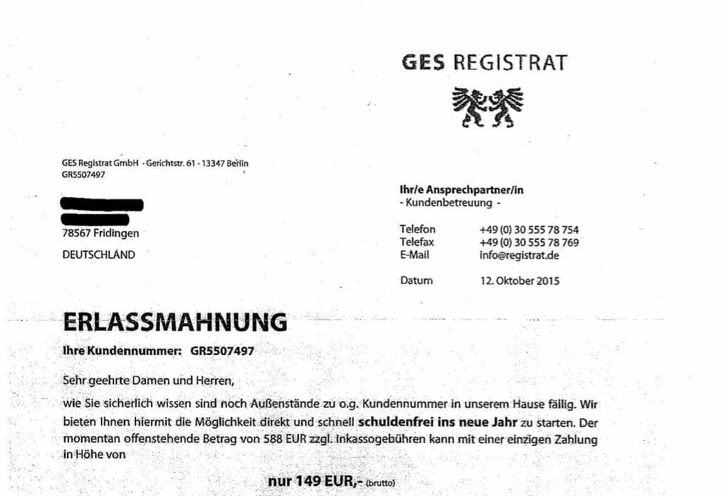 Lothar Hempel, Rechtsberater bei der Handwerkskammer Konstanz, rät Betrieben dazu, trotzdem einfach abzuwarten. "So etwas wie eine Erlassmahnung gibt es überhaupt nicht. Das ist ein Phantasiewort", erläutert Hempel. Da die GES Registrat GmbH der ursprünglich angesetzten Forderung über 588 Euro offenbar schon keine Durchsetzungsfähigkeit zubillige, sollten Betriebe keinesfalls auf den Vergleich über 149 Euro einzugehen. Die Zahlungsfrist könnten Betroffene getrost verstreichen lassen – auch weil die Gefahr besteht, dass für das zweite Vertragsjahr wieder Mahnungen zuge schickt werden.