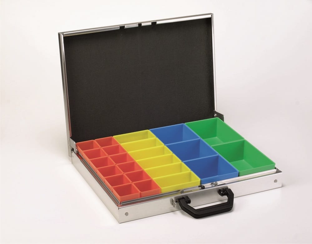 Der Aluca-Aluminiumkoffer hat ein Eigengewicht von 1,25 kg und einen ergonomischen Handgriff. Mit den verschiedenfarbigen und unterschiedlich großen Kunststoffboxen zur übersichtlichen Aufbewahrung von Kleinteilen bringt er 2,14 kg auf die Waage. Maße: 435 mm Breite, 332 mm Tiefe und 66 mm Höhe.