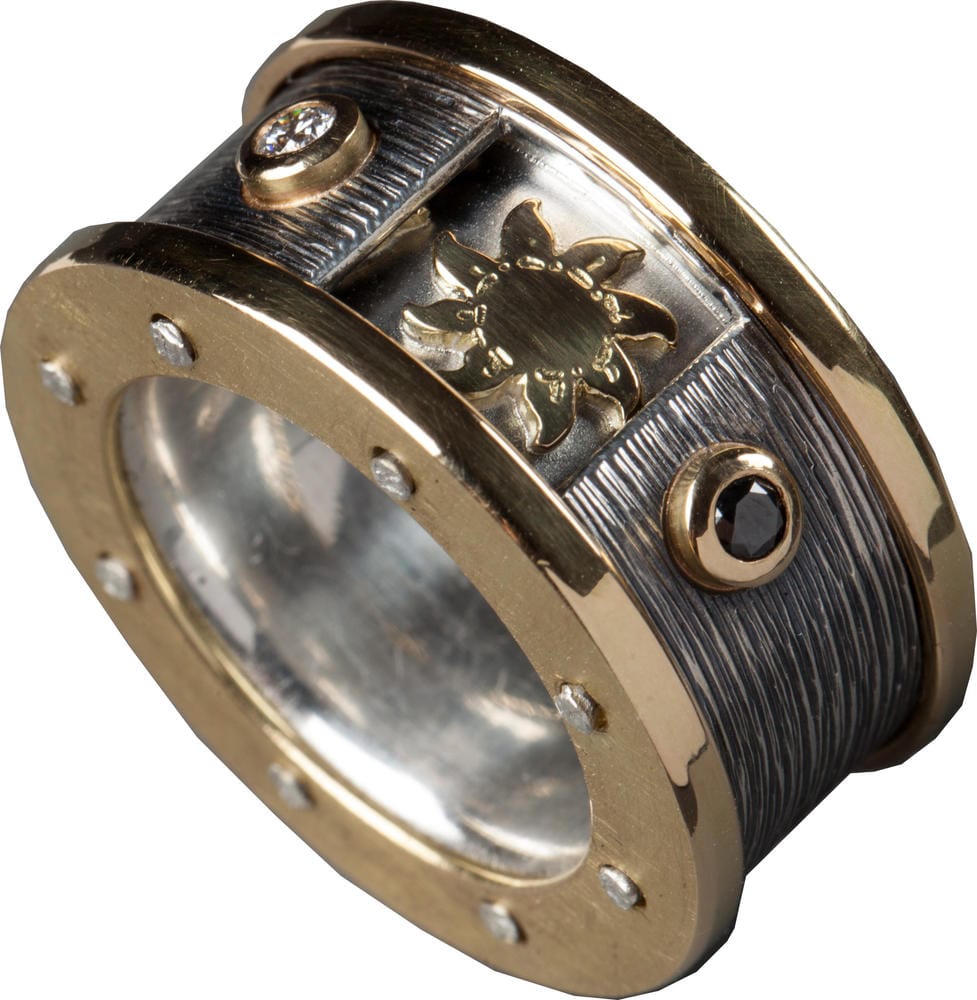 Die Idee dazu, wie der Ring aussehen soll, sei im Kopf entstanden, erzählt sie. Die reine Bauzeit habe knapp drei Wochen betragen. Verwendet hat die Goldschmiedin, darauf legt Marklein-Paas großen Wert, nur Öko-Gold und Öko-Silber. Ein schwarzer und ein weißer Brillant einerseits, Nieten die die Einfassungen mit dem eigentlichen Ring verbinden anderseits verhalfen zu dem angestrebten „Spagat zwischen einer hochwertigen, einzigartigen Optik und dem typischen ‚Rocker’-Ring“. Gefertigt hat sie das immerhin 55 Gramm wiegende Meisterstück ganz klassisch per Hand „mit Diffusionsfugen nach alter Goldschmiedetradition gelötet“.