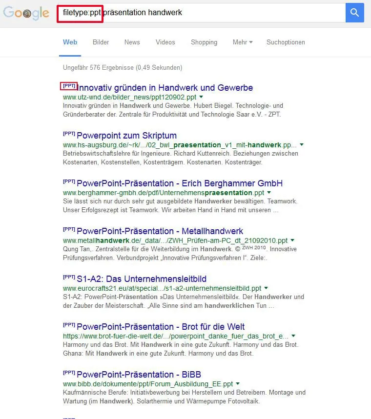 Wer auf der Suche nach bestimmten Dateitypen ist, ist mit dem Operator "filetype:" gut beraten. Nach dem Operator einfach den gewünschten Dateityp eingeben (pdf, ppt, doc usw.) und schon werden nur noch Dateien angezeigt, die den gewünschten Suchbegriff enthalten.
