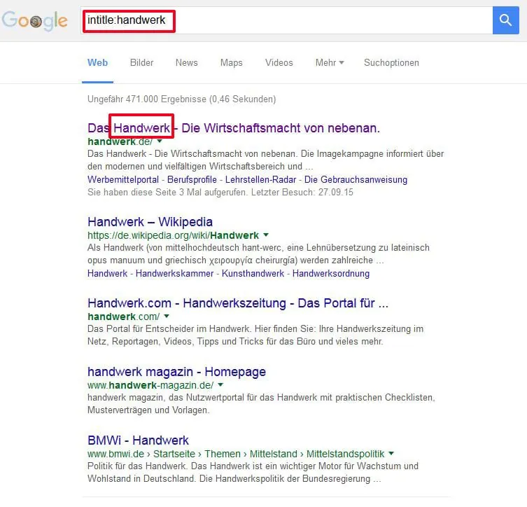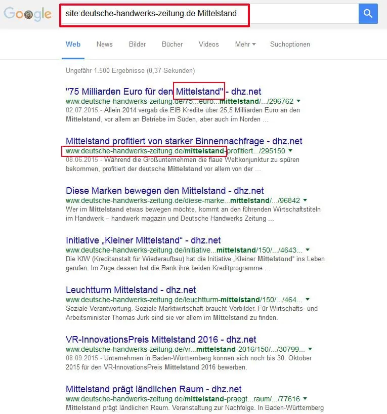 Weitere wichtige Befehle sind "site:" oder "inurl:". Hier wird die Suche nur innerhalb einer bestimmten Domain oder einer bestimmten Webadresse durchgeführt. Setzt man also beispielsweise den Operator site: vor die Domain der Deutschen Handwerks Zeitung (DHZ) und fügt dahinter den gewünschten Suchbegriff ein, wird lediglich die Internetseite der DHZ nach dem Begriff durchforstet.