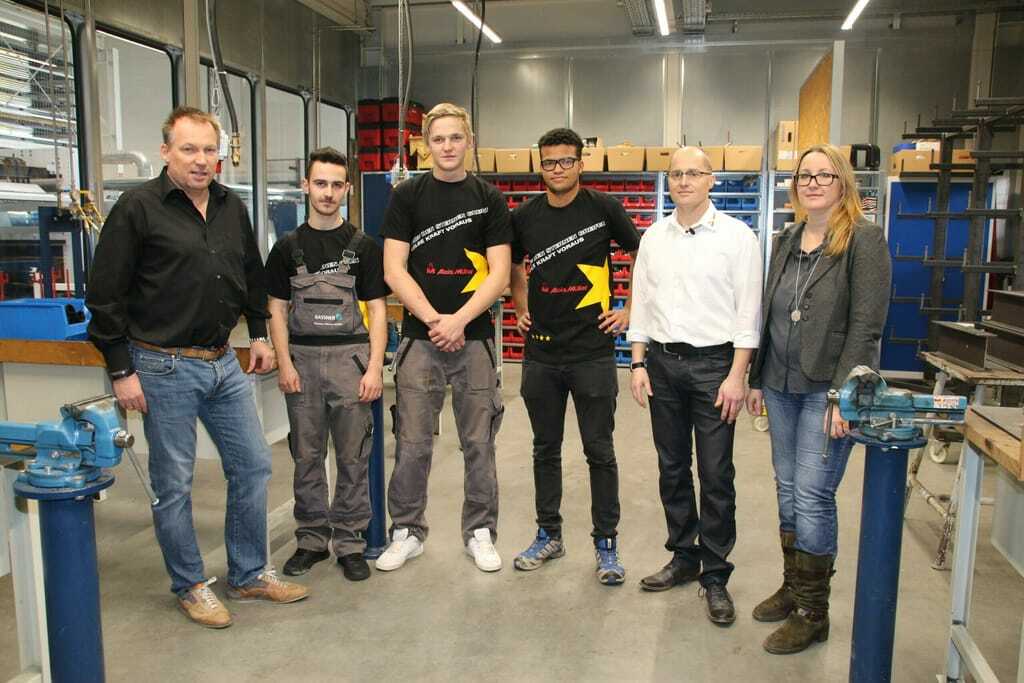Erfolgreich im Team: Geschäftsführer Andreas Müller (links), Ausbildungsleiter Alexander Esters (2. von rechts) und Beate Bertsch mit drei Auszubildenden. - © Foto: Si/md