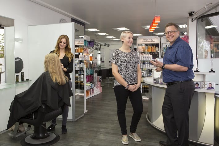 Arbeiten in Wohlfühlatmosphäre: Saloninhaber Dennis Lessing (rechts) im Gespräch mit Friseurin Franziska Hellwig, links Friseurin Lea Klaus mit einer Kundin. - © Foto: Artur Worobiow