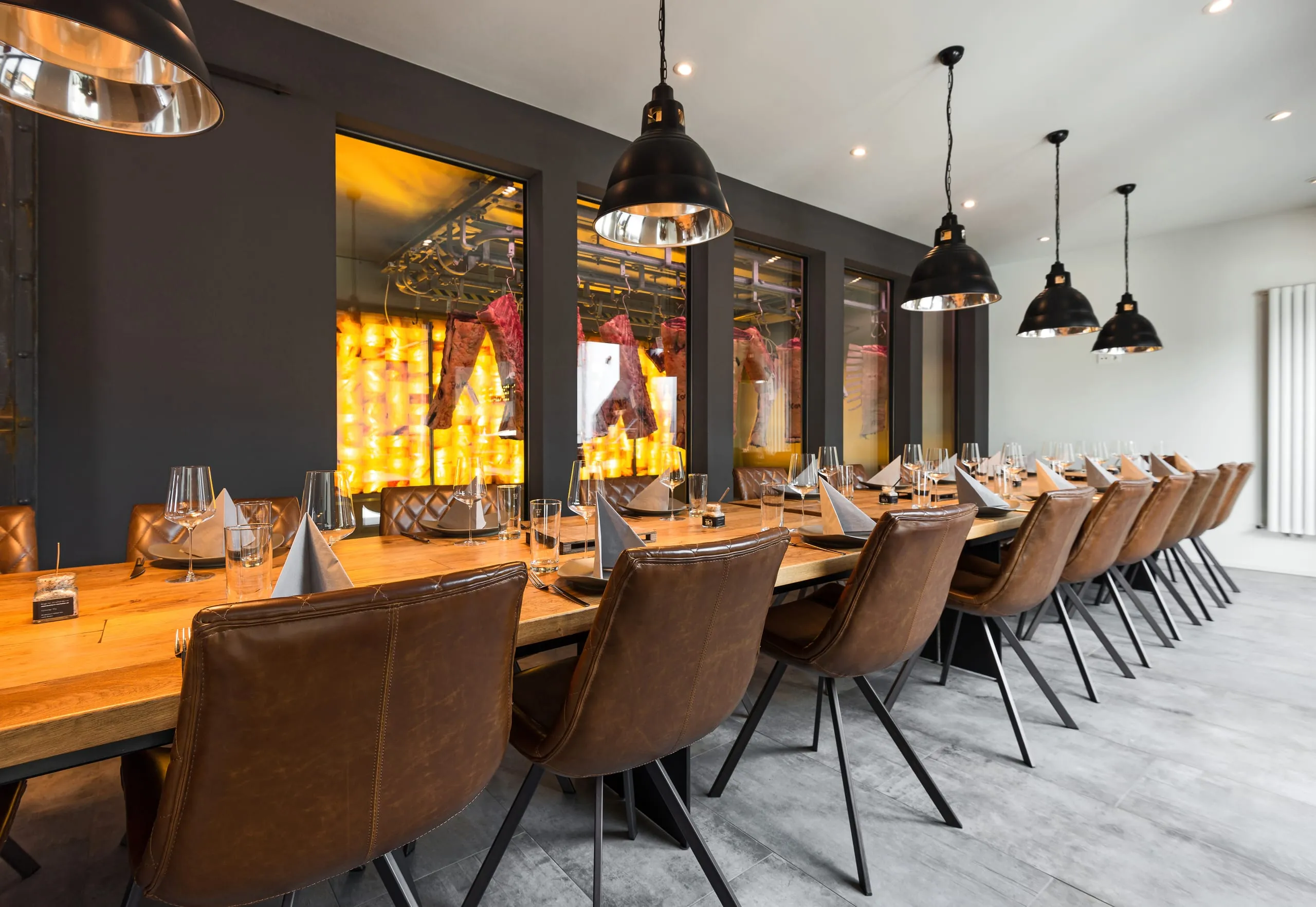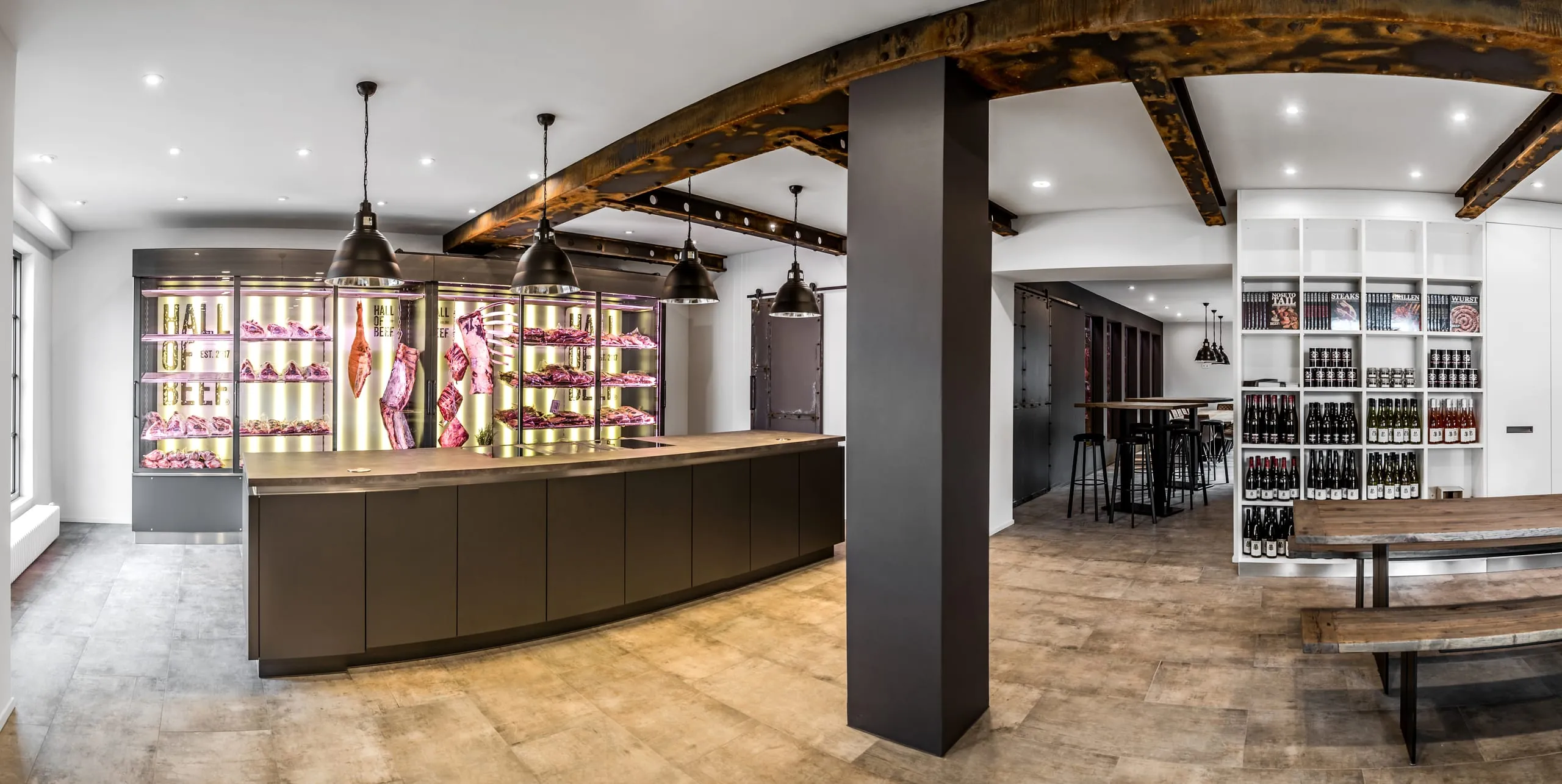 Was diesen Ort so besonders macht? Metzgermeister Jürgen David will es zeigen. Er öffnet die schwere grau-schwarze Eisentür zur "Hall of Beef". 2017 ist hier, direkt neben seiner Metzgerei, eine Eventlocation entstanden. Sofort sticht der Mix aus rustikalem und modernem Design ins Auge. Eisenträger erstrecken sich entlang der Decken. Große Tische aus massivem dunklen Holz umgeben von dunkelbraunen Lederstühlen warten auf die nächsten Gäste. Schweift der Blick nach rechts, so erstrahlen an den Wänden Hochglanzbilder von saftigen Steaks und Filets, die auf schwarzem Hintergrund in Szene gesetzt werden. In einer weißen Regalwand stehen verschiedene Weine und Gewürze, die das Steak-Erlebnis begleiten sollen.