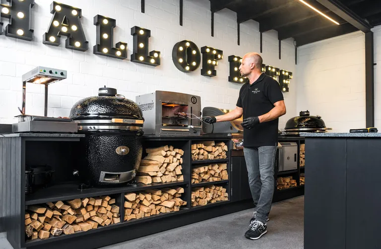 Gegrillt wird im zum Teil überdachten großzügigen Innenhof, von der "Hall of Beef" ist er nur durch eine Glasfront getrennt. Das schwarze Design in Kombination mit Holz setzt sich hier fort. Im Innenhof stehen viele verschiedene Grills, damit Jürgen und seine Teilnehmer jedes Steak individuell zubereiten können. Auf der anderen Seite des Hofs grenzen die moderne Metzgerei samt Produktions- und Verkaufsraum an.