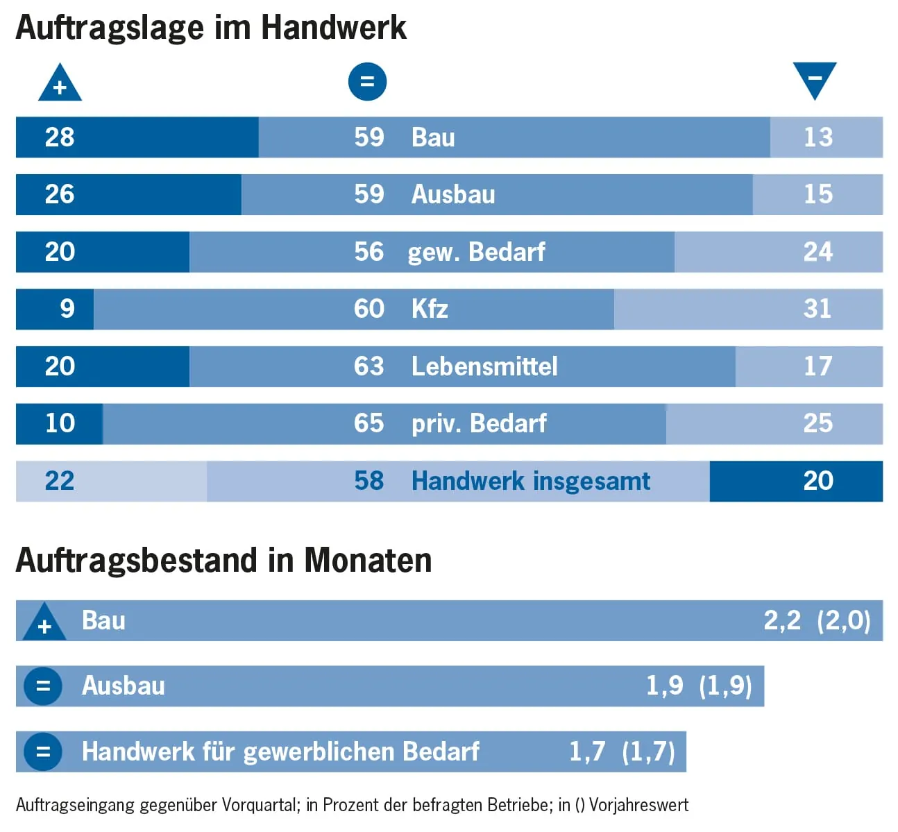 Im Einklang dazu schilderten die Handwerksfirmen ihre aktuelle Geschäftslage mit großem Optimismus. Gemäß den Antworten von rund 9.500 Betrieben gewann der Index im Vergleich zum zweiten Quartal 2013 zwei Punkte hinzu und schloss bei 88 Zählern. Vor einem Jahr hatten ebenfalls 88 Prozent der Befragten ihre Situation mit gut oder befriedigend beurteilt.