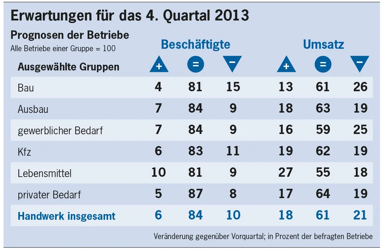 Der Bau prägt nicht nur die Stimmung, er ist auch für die insgesamt positive Einschätzung der Umsatzentwicklung verantwortlich. So lag der Saldo aus Zuwächsen und Einbußen mit plus fünf höher als im dritten Quartal 2012 (±0). Deswegen und in Anbetracht der hohen Auslastung schätzt die Deutsche Handwerks Zeitung, dass die nominalen Umsätze erstmals seit dem Winter des vergangenen Jahres wieder an ihr Vorjahresniveau heranreichten oder es womöglich sogar übertrafen. Einer noch deutlicheren Besserung stand die Investitionszurückhaltung der deutschen Industriekundschaft entgegen.