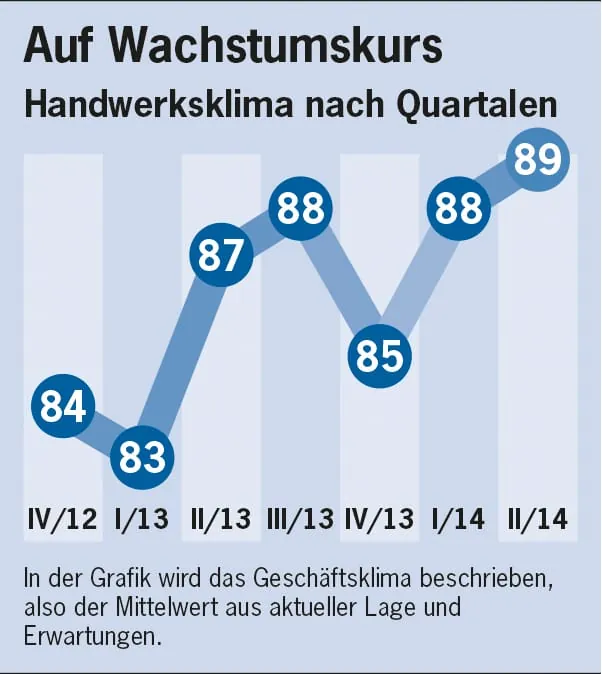 Die Konjunktur im Handwerk ist im Jahr 2014 stark wie selten. Der Geschäftsklima-Index, der die aktuelle Lage und die Erwartungen der Betriebe misst, liegt nach dem zweiten Quartal 2014 bei 89 Punkten und damit auf einem Höchststand. Dieser Wert wurde nur 2011 erreicht und seit 20 Jahren nicht mehr übertroffen.