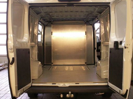Die Handwerker-Trennwand der Firma Engelhart Transportkühlmaschinen-Servicekann im Fahrzeug verschoben werden. Dazu müssen die Transporter in Kempten umgerüstet werden. Sie bekommen eine Bodenplatte mit integrierten Airline-Schienen, die auch unter dem Dach montiert werden. An ihnen wird die Trennwand befestigt.