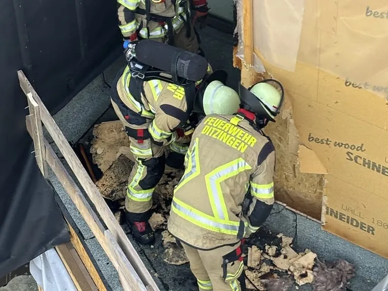 Auf einer Baustelle in Ditzingen (Baden-Württemberg) haben Handwerker am Mittwochnachmittag einen größeren Brand an einem Neubau verhindert. Sie entdeckten das Feuer an einer Holzfassade und begannen sofort mit ersten Löscharbeiten, noch bevor die alarmierte Feuerwehr eintraf. Die Einsatzkräfte mussten anschließend Teile der Fassade öffnen, um letzte Glutnester zu löschen.