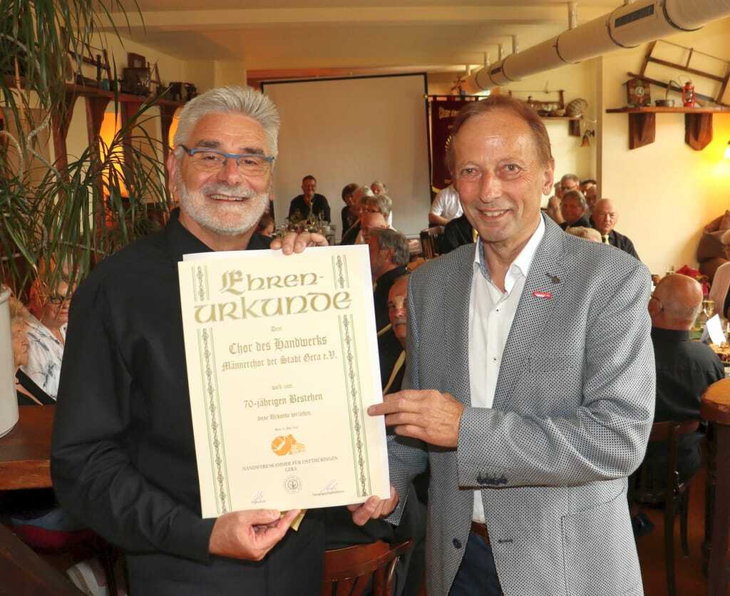 Zur jetzigen Festveranstaltung anlässlich des 70-jährigen Chorjubiläums überreichte Kammerpräsident Wolfgang Jacob an den Chor die entsprechende Ehrenurkunde und überbrachte die Glückwünsche des Vorstandes sowie der Geschäftsleitung der Handwerkskammer. Über all die vielen Jahre war und ist die Handwerkskammer Partner des Chores, hat die Mitglieder nach besten Möglichkeiten unterstützt und auf ihrem Weg begleitet. Sei es bei der Finanzierung ihrer Chorbekleidung für ein einheitliches Erscheinungsbild bei den Auftritten oder die finanzielle Unterstützung bei Veranstaltungen."Ich darf Ihnen versichern, dass wir als Handwerkskammer auch künftig zu unserem Chor des Handwerks hier in Ostthüringen stehen", so Wolfgang Jacob.