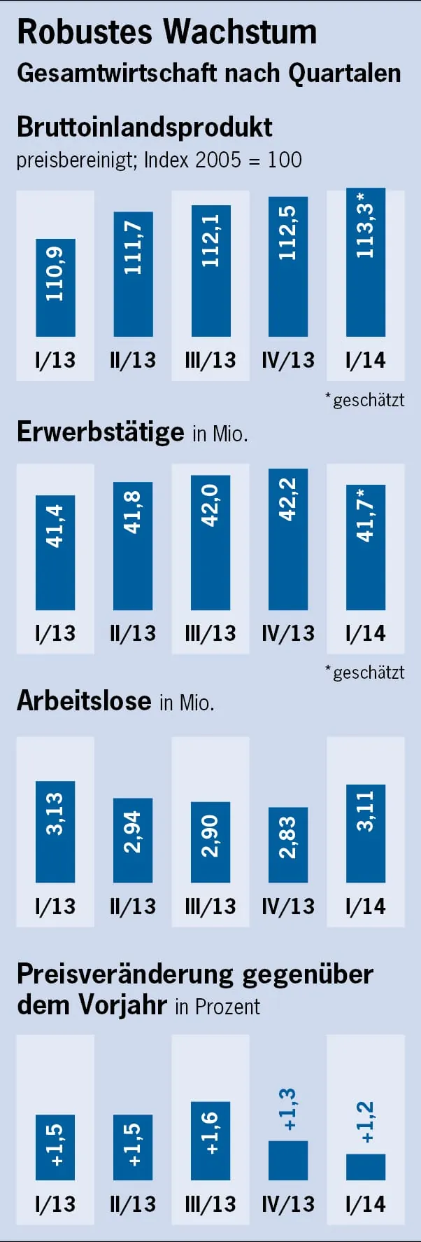 Dank des milden Winters wurde die Auslastung zwischen Dezember und März nur moderat zurückgefahren. Mit durchschnittlich 75 Prozent übertraf sie das Ergebnis aus dem ersten Quartal 2013 um vier Punkte. Dementsprechend verbesserte sich die Geschäftslage. Der Indikator für die aktuelle Stimmung legte binnen Jahresfrist ebenfalls beträchtlich um sieben Punkte zu.