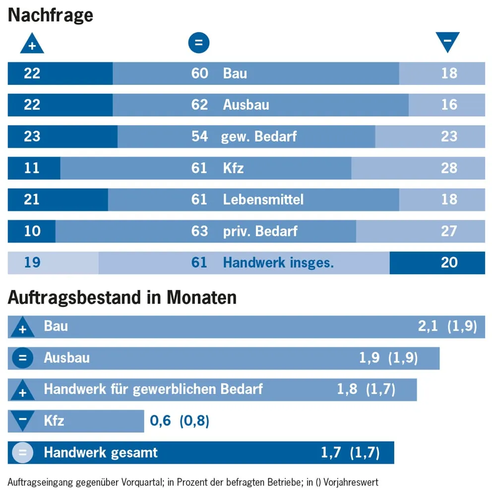 Während der Konsum auf Lebensmittelhandwerker und das Gastgewerbe spürbar ausstrahlt, kann sie die Stimmung im Handwerk für den privaten Bedarf (Uhrmacher, Goldschmiede, Maßschneider, Friseure etc.) nicht ganz so deutlich aufhellen. In der wettbewerbsintensiven Branche ist das ein gewohntes Bild. Zwar sind 84 Prozent der Befragten mit ihrer Lage einverstanden, sie liegen damit jedoch klar unter dem Durchschnitt aller Branchen. Lediglich sechs Prozent stellten zusätzliche Arbeitskräfte ein.