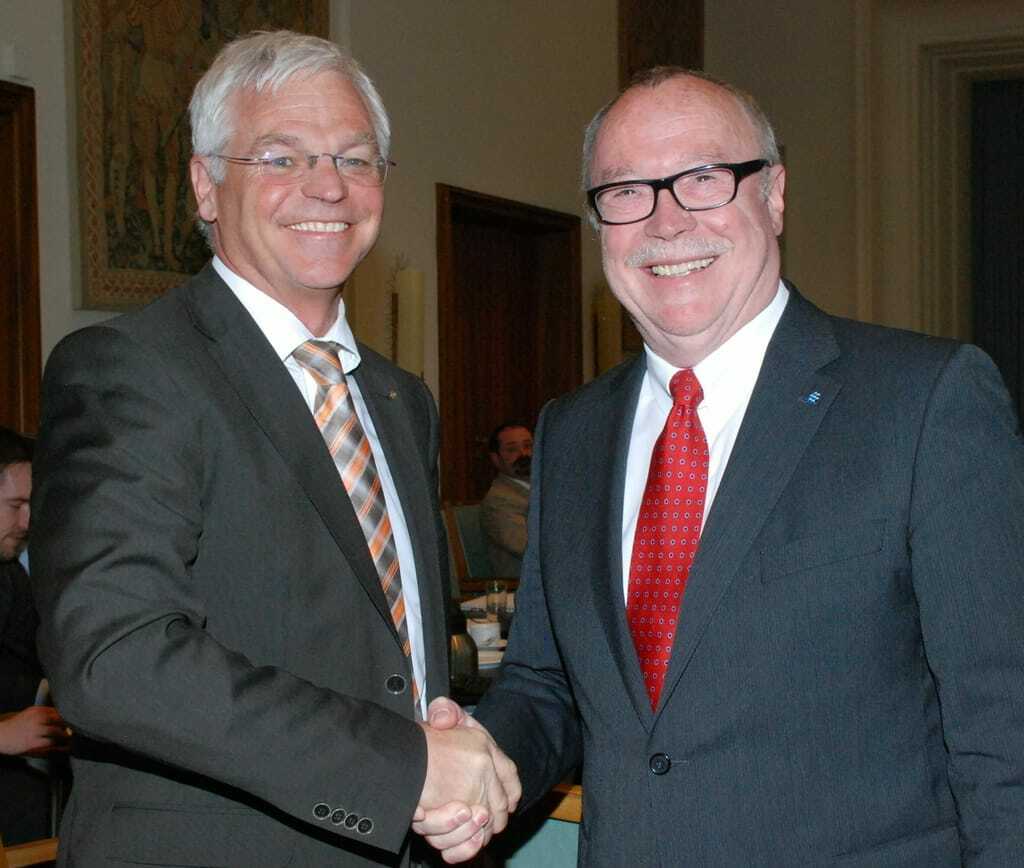 Neuer Vorsitzender von Holzbau Deutschland: Peter Aicher (li.) nimmt die Gratulation vonVorgänger Ullrich Huth entgegen. - © Foto: Küttner/Holzbau Deutschland