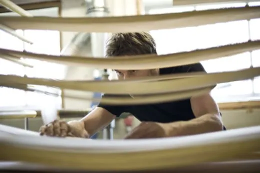 Der Schreiner legt dabei Wert auf die hochwertigsten Rohstoffe. Schwarz sucht sich extra dafür im Sägewerk nur das beste Holz aus. Dabei achtet er auf ganz besondere Details, wie etwa die Jahresringe. Diese müssen exakt senkrecht zum Holzstreifen verlaufen. Sind die Streifen verleimt, bekommt der Skikern sein Profil, eine Keilform in der Länge. Seine Spannung und damit seine geschwungene Grundform bekommt der Ski dadurch, dass der Holzkern überspannt und dann entsprechend abgehobelt wird. Der so vorgeformte Kern wird dann in Schablonen mit verschiedenen Lagen aus Carbon und mit Epoxidharz verpresst. Zum Schluss erhält der Ski die Metallkanten und ein Furnier.
