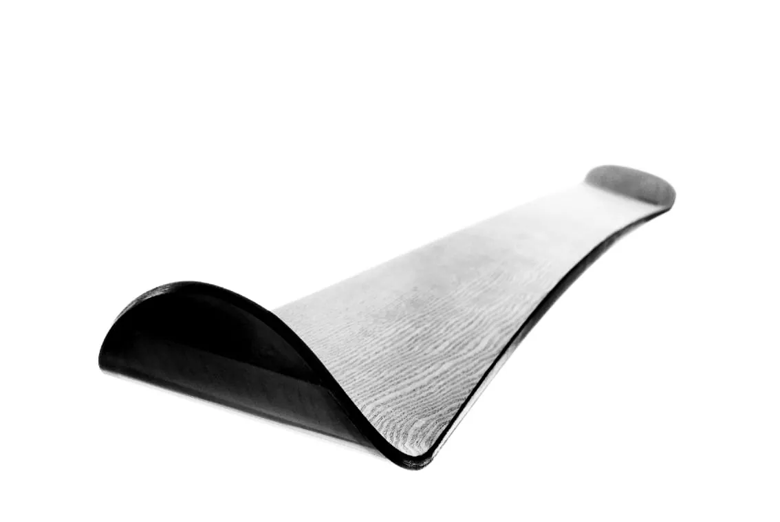 Die Skier zeichnen sich durch eine schlichte Eleganz aus. Die Maserung des Holzes gibt ihnen ihre Unverwechselbarkeit, eingerahmt durch dünne Metallschienen. Erst in der Rundumansicht ergibt sich ein vollständiges Bild. Denn Schwarz hat für seine Skier natürlich nicht auf moderne Materialien verzichtet. Außer dem Holz hat der Ski mit den alten Brettern, wie sie bis Mitte der 50er Jahre in Gebrauch waren, nichts gemein. Die Grundlage für den Ski ist wie damals Eschenholz. Die Esche wird kombiniert mit Fichte und Ahorn, um Gewicht zu sparen. Der Kern des Skis besteht aus verleimten Streifen, die aus den Baumbrettern geschnitten werden.