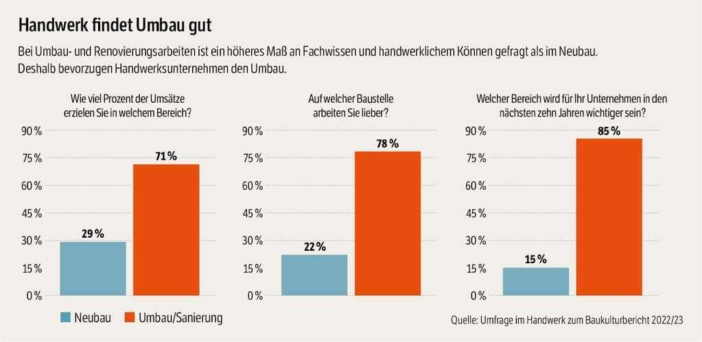 Tatsächlich steht das Motto "Umbau vor Neubau" im Handwerk hoch im Kurs, wie eine Umfrage für den Baukulturbericht 2022/23 ergab. Demnach sind bei Umbau und Renovierung 86 Prozent der Handwerker häufig oder sehr häufig in gestalterische Entscheidungen eingebunden, bei Neubauten nur 36 Prozent. 78 Prozent der befragten Betriebe würden sich bei Bauvorhaben gern stärker bei der Gestaltung und der Materialauswahl einbringen. Wenn handwerkliches Know-how und Improvisationsgeschick durch mehr Bauen im Bestand im Ansehen steigt, würden auch die Bauberufe an Attraktivität gewinnen.