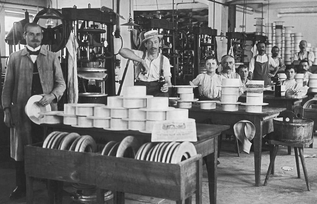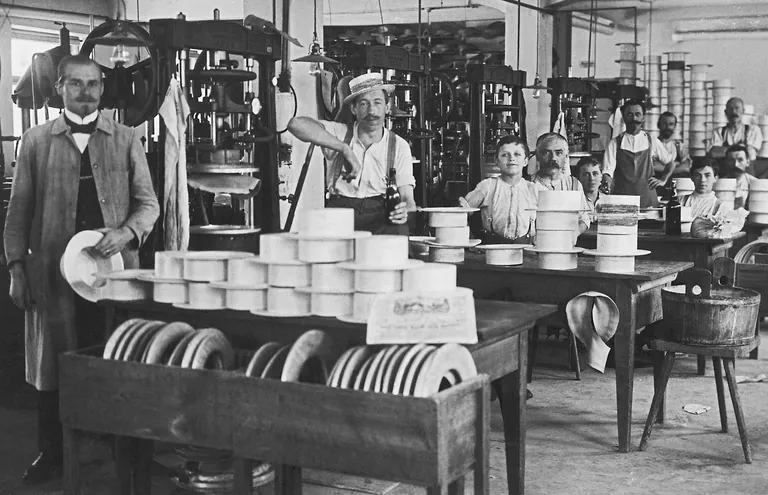 Historische Aufnahme aus der Hutfabrik Ottmar Reich in Lindenberg: Arbeiter bei der Matelotherstellung. - © Deutsches Hutmuseum