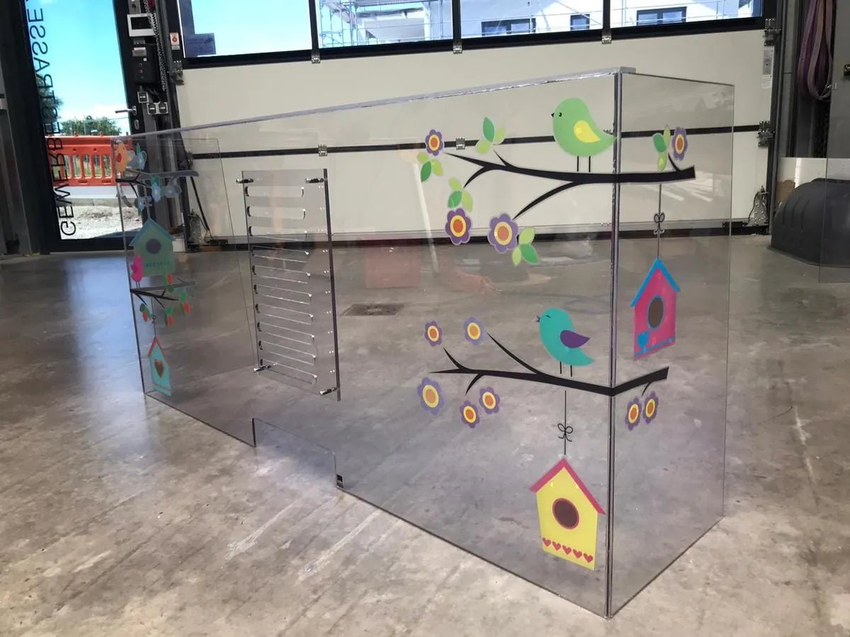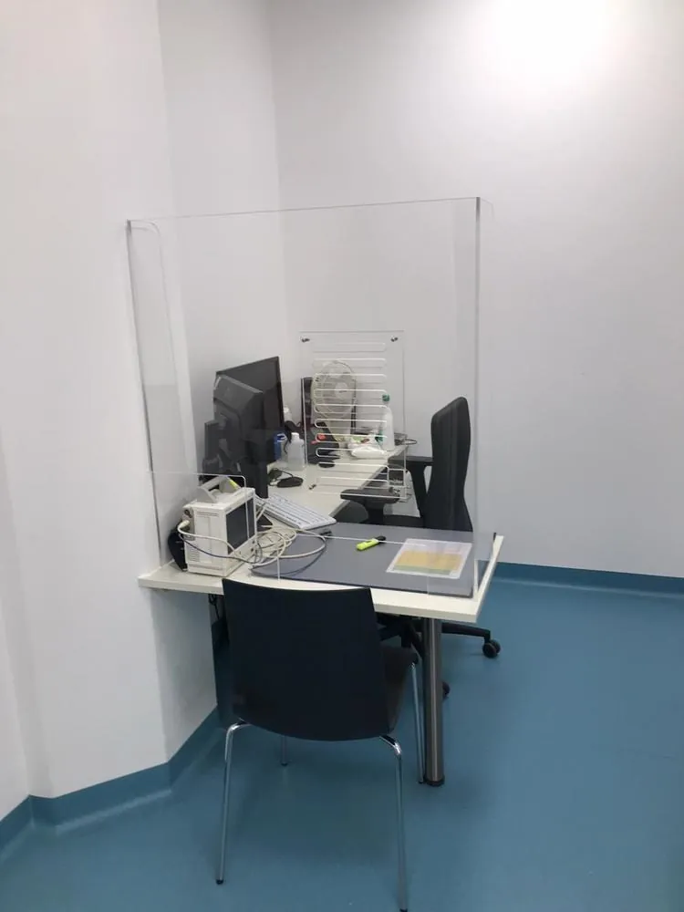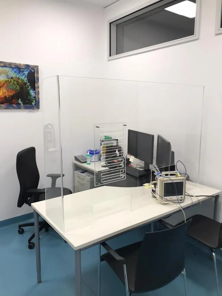 Die werden auch weiterhin nicht abreißen. Denn nachdem ihm das Klinikum von den Schwierigkeiten im Dialog mit den Patienten und Besuchern berichtete, grübelte er zuhause über eine mögliche Lösung. Erste Versuche mit kreisrunden Bohrungen ergaben kein schönes Bohrbild. Die zündende Idee hatte schließlich sein 8-jähriger Sohn Leo. "Papa, mach doch Schlitze rein", habe er gesagt. Und sein Vater machte genau das. Mit einer CNC-Maschine fräst Müller seither auf Augenhöhe ovale Aussparungen in seine Hygieneschutzwände aus Plexiglas. Zweieinhalb Zentimeter nach hinten versetzt, montiert er in Richtung Personal eine zweite Scheibe.