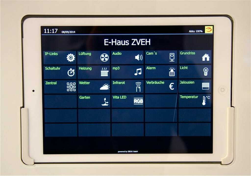 Dann das Wohnzimmer: Hier spielt der Wohnkomfort die größte Rolle. LED-Leuchten an der Decke, die möglichst wenig Strom verbrauchen, lassen sich dimmen und in verschieden farbiges Licht verändern. Stereoanlagen, Fernseher, Jalousien, Heizung und Lüftung – alles ist an die smarte Steuerung angeschlossen und lässt sich über ein Gerät regeln. Zusätzlich gibt es dafür in jedem Raum einen kleinen Touchscreen an der Wand, der die verschiedenen anwählbaren Funktionen anzeigt – inklusive des aktuellen Stromverbrauchs und der Kosten.