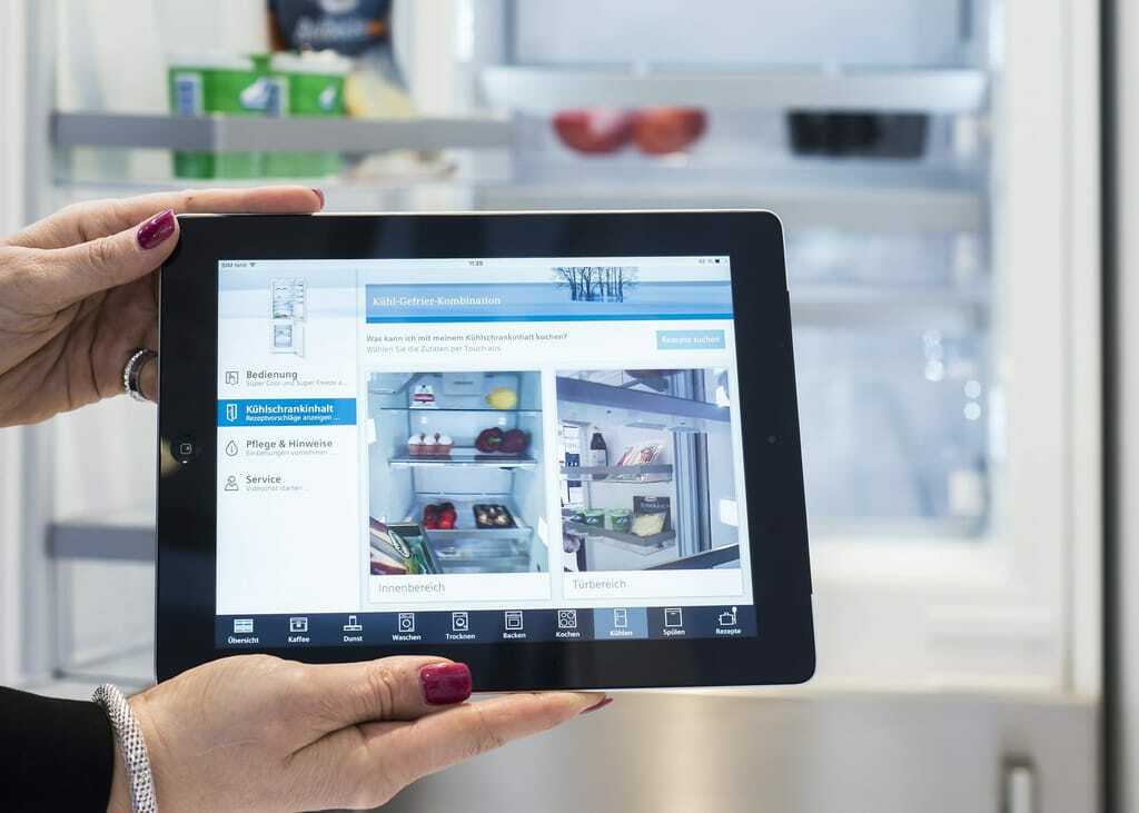 Weiter geht es in die Küche und auch hier spielt wie in allen anderen Räumen das Smartphone oder Tablet eine zentrale Rolle. Es kann als Steuerung für alle angeschlossenen Geräte verwendet werden. Zwar haben die Hersteller der Küchengeräte die herkömmlichen Knöpfe und Rädchen nicht abgeschafft, über den Touchscreen geht es allerdings bequemer. So kann man beispielsweise den Backofen vom Sofa aus regulieren, man kann die Spülmaschine an- und abschalten oder nachsehen, was alles noch im Kühlschrank ist – er Kühlschrank hat mehrere Kameras integriert, die sich per WLAN ansteuern lassen.