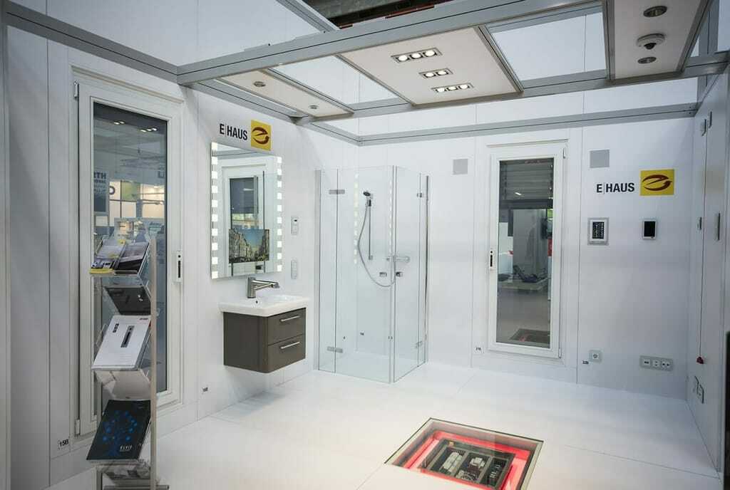 Gleichzeitig wurden einige weitere Bedienelemente optimiert. So ist das E-Haus nun auch über Smart-Watches steuerbar und kann so programmiert werden, dass man mit dem Smartphone einen QR-Code einliest und dann alle Geräte nur für einen bestimmten Zeitraum nutzen kann – beispielsweise für Hotels ein praktikables Modell. Außerdem gibt es neue Apps und neue optische Elemente, die mit der Technik verknüpft sind wie etwa eine Fliese im Badezimmer hinter der die Steuerung versteckt ist. Sie reagiert allein durch die Berührung mit der Hand.