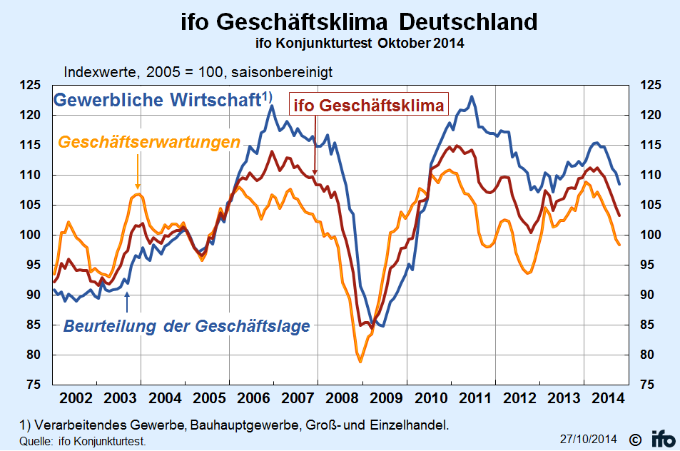 Die Stimmung in der deutschen Wirtschaft hat sich eingetrübt. Laut Informationen der Agentur "dpa" ist der Geschäftsklimaindex im Oktober von 104,7 auf 103,2 Punkte und somit den sechsten Monat in Folge gesunken. Das ist der tiefste Stand seit Dezember 2012.