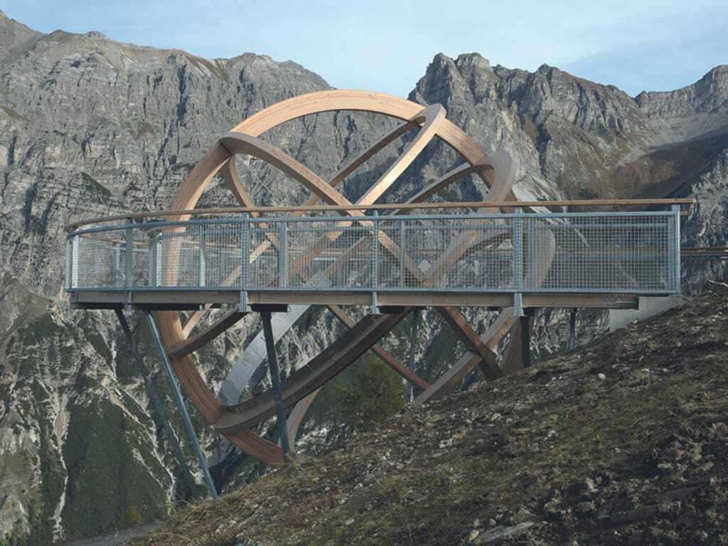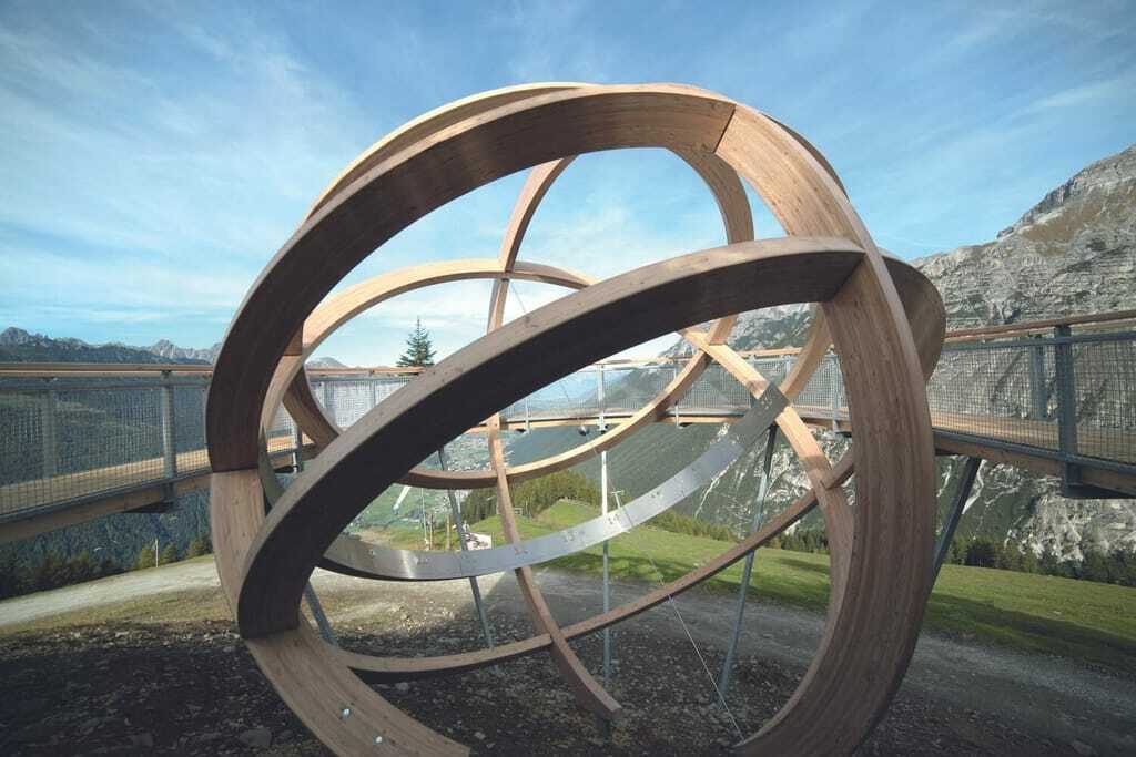 Mit der Gondelbahn schwebt man hinauf zur Bergstation des Elfers und schon beim Ausstieg ist sie sichtbar, die riesige, hölzerne und begehbare Sonnenuhr. Hier lautet das Motto, einmal kurz innehalten und die Zeit hautnah erleben.