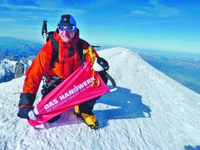 Das Kunststück fertiggebracht hat der Chemnitzer Extrembergsteiger Jörg Stingl: Er hisste im Auftrag der Handwerkskammer Chemnitz auf dem Gipfel von Europas höchstem Berg, dem Mont Blanc zwischen Italien und Frankreich, ein rotes Banner der Imagekampagne just am „Tag des Handwerks“.