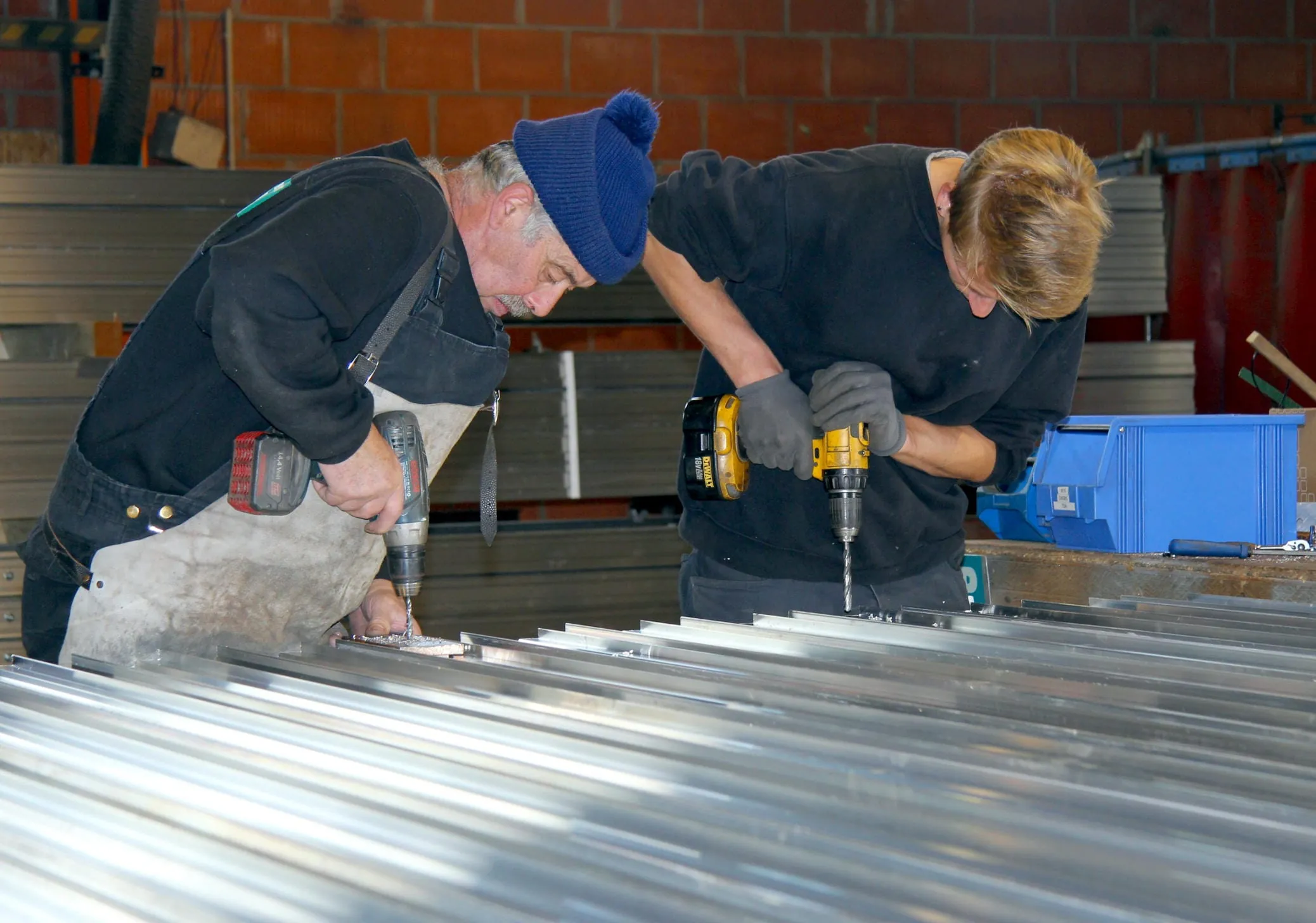 Produktion vor Ort in Hessen: Mitarbeiter bei der Konfektionierung von Montagegestellen für Photovoltaik-Anlagen.