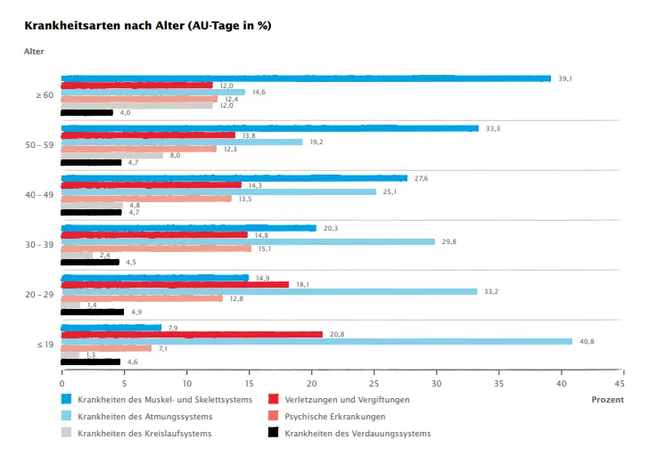- Krankheitsarten (Muskel- und Skelett, Atemweg, Verletzungen, psychische Erkrankungen)