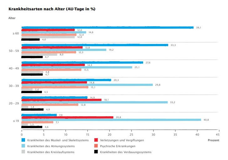 - Krankheitsarten (Muskel- und Skelett, Atemweg, Verletzungen, psychische Erkrankungen)