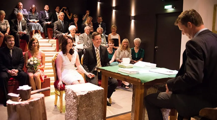 In einer kleinen mittelfränkischen Stadt können sich Paare an einem ganz besonderen Ort trauen lassen: Das Schwabacher Stadtmuseum beherbergt eine würfelförmige Goldbox, die mit 10.000 Blattgold-Quadraten versehen ist. Im Inneren befindet sich eine aufsteigende Sitzreihe mit Blick auf eine historische Goldschläger-Werkstatt.