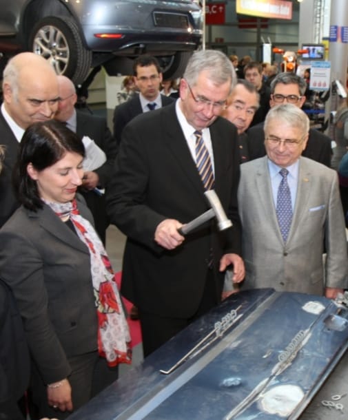 Beim Rundgang auf der Internationalen Handwerksmesse legte der Mittelstandsbeauftragte der Bundesregierung, Ernst Burgbacher (FDP, Mitte), selbst Hand an. Foto: Schuhmann