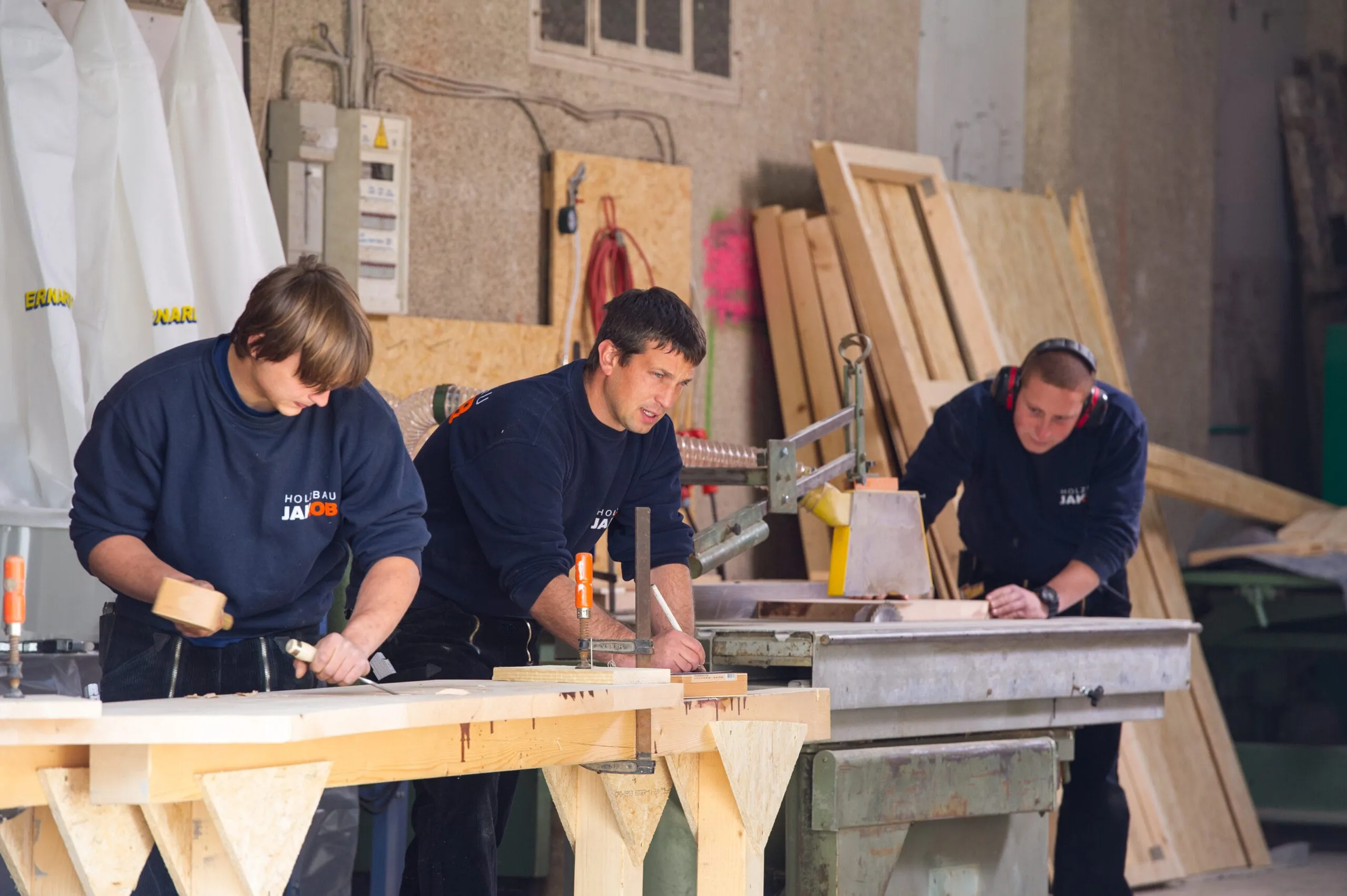 Schreinermeister Andreas Jakob (Mitte) mit seinem Team in der Werkstatt.