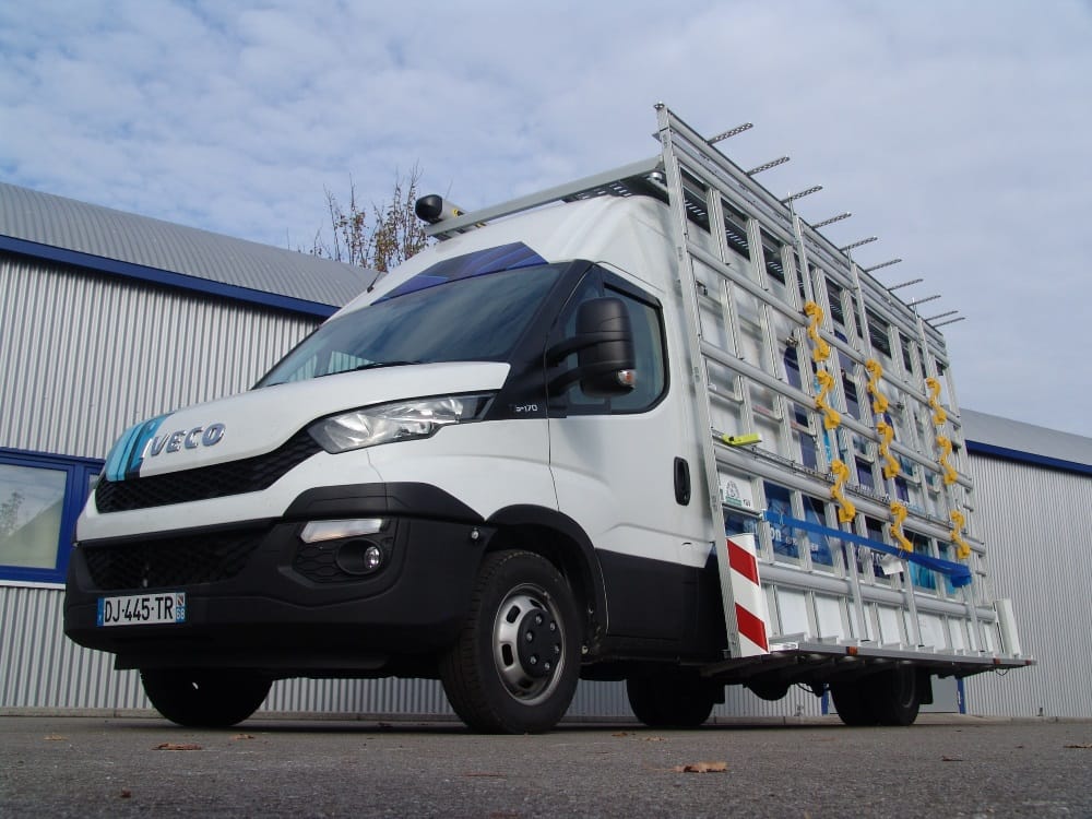 Aufgrund des immer noch verbleibenden Innenraums können Glasplatten bis ca. 4 x 2 m mittels eines Innenreffs sicher transportiert werden. Ein Ladungssicherungssy stem mit Spannstangen und Zurrmöglichkeiten gehört genauso zur Ausstattung wie der eloxierte Dachträger mit Windleitblech und einem heckseitigen Abroller.