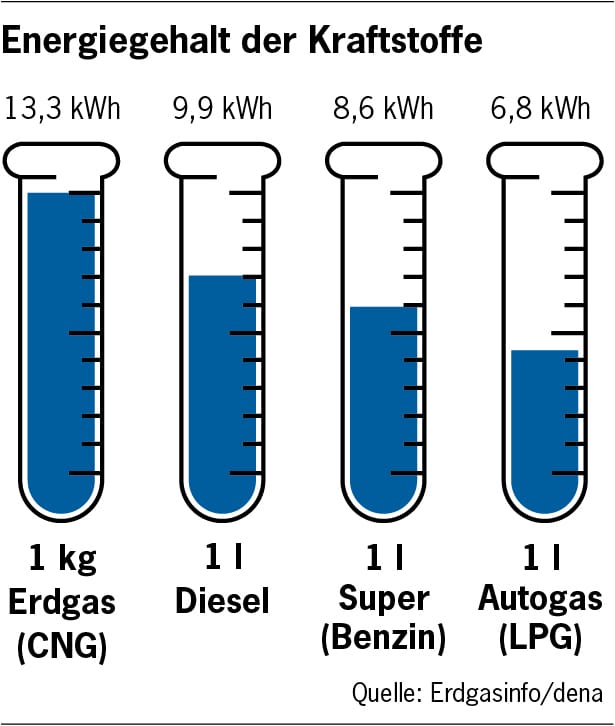 Während die Preise für Benzin, Diesel und Autogas in Litern ausgezeichnet sind, wird Erdgas nach Kilogramm bepreist. Die Initiative Erdgasmobilität rät daher dazu, den Energiegehalt zu vergleichen. In einem Kilogramm Erdgas steckt mehr Energie als in Diesel oder Benzin.