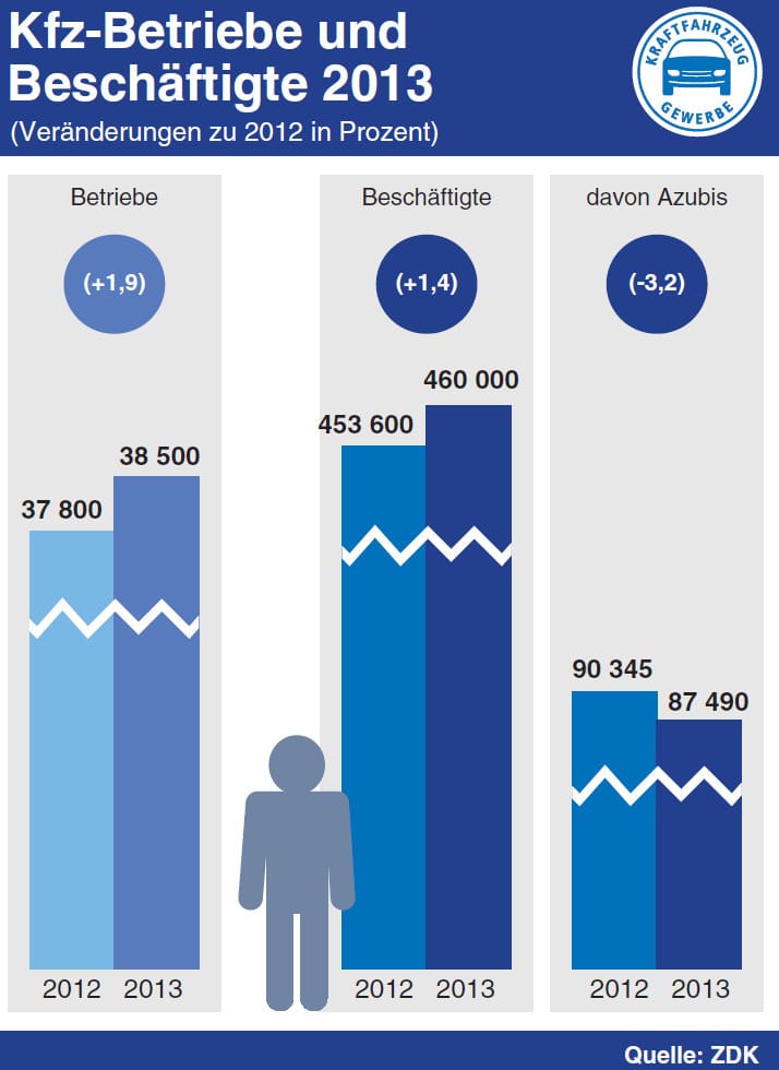 Mehr Betriebe, mehr Beschäftigte aber weniger Azubis: Auch das Kfz-Gewerbe bekommt die demografische Entwicklung zu spüren. - © Grafik: ZDK