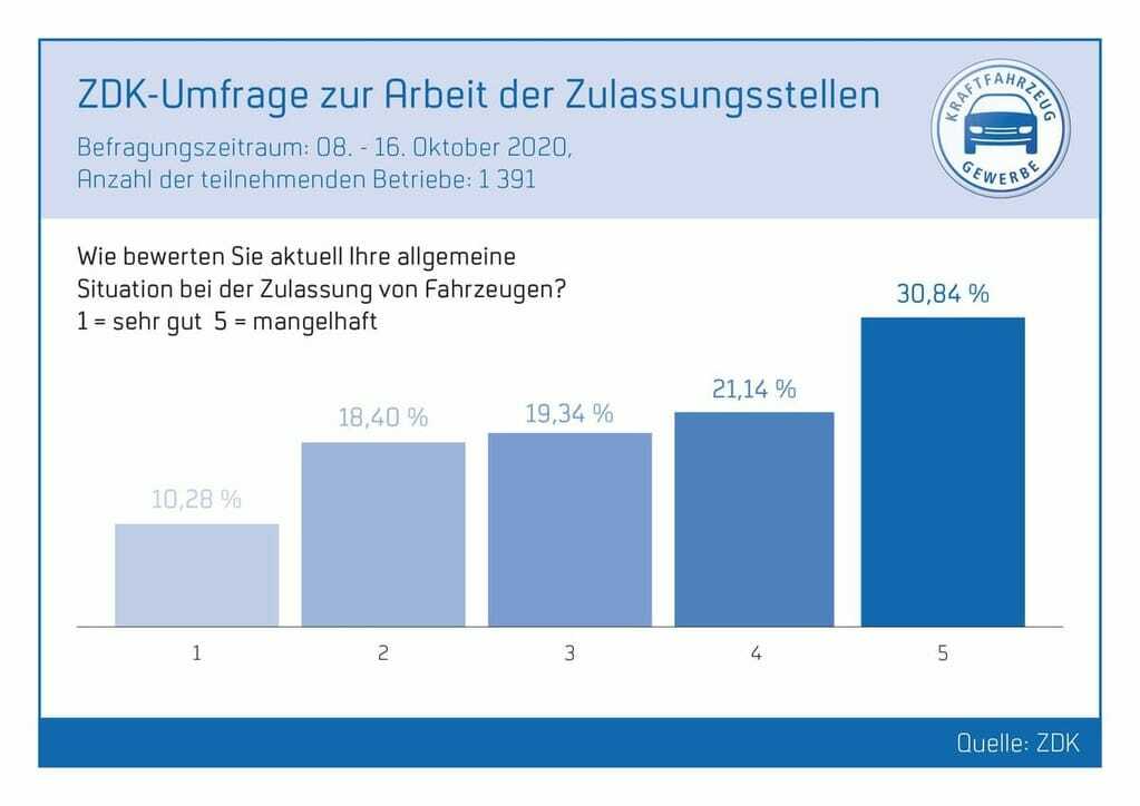 Der Zentralverband Deutsches Kraftfahrzeuggewerbe (ZDK) beklagt die verzögerte Zulassungspraxis in den Kfz-Zulassungsstellen. Grund seien die Corona-bedingt eingeschränkten Öffnungszeiten und nur wenige verfügbare Termine. Laut einer Umfrage des ZDK unter knapp 1.400 Unternehmen hatten 52 Prozent der Befragten die Schulnoten 4 und 5 für die Situation in der Fahrzeugzulassung vergeben.