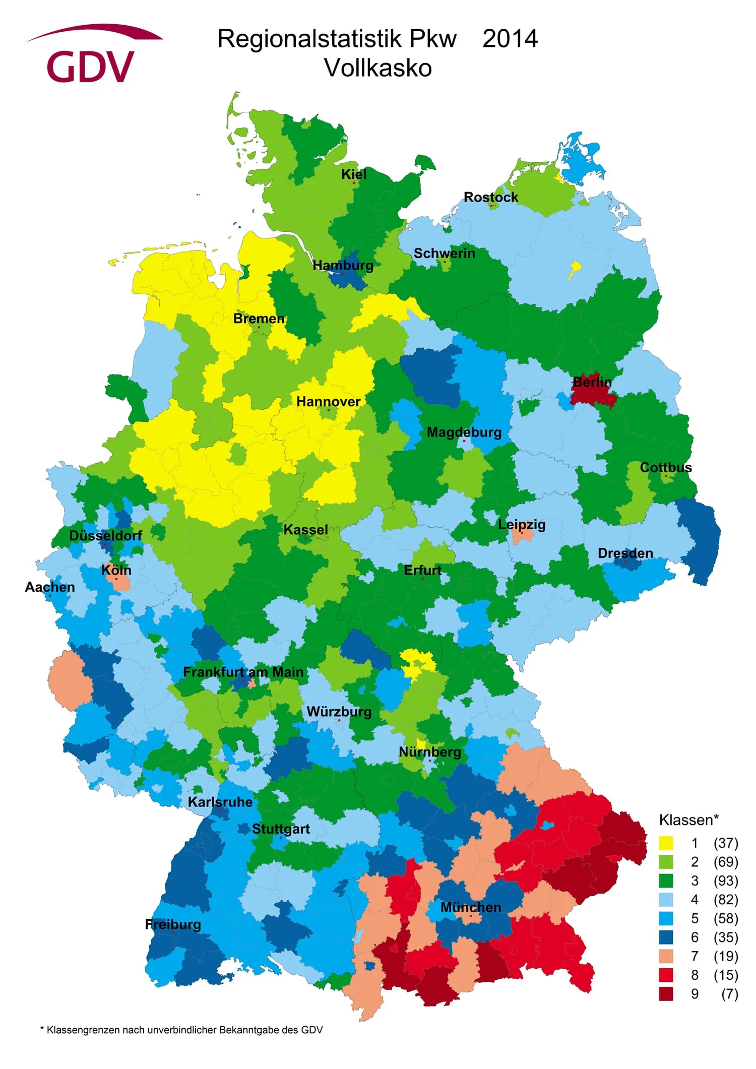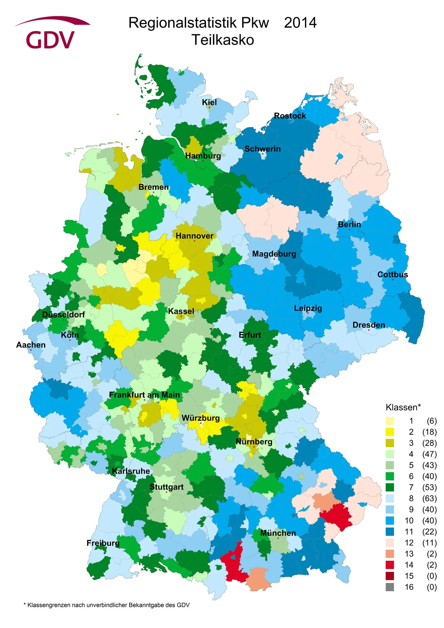 Die Regionalstatistik spiegelt die Schadenbilanz einer bestimmten Region wider. Für die Haftpflicht gibt es zwölf, die Teilkasko 16 und die Vollkasko neun Klassen. So haben das Fahrverhalten der Autofahrer, die Anzahl der zugelassenen Fahrzeuge und die örtlichen Straßenverhältnisse Einfluss auf die Versicherungsbeiträge. Außerdem werden in der Kaskoversicherung örtliche Besonderheiten berücksichtigt, wie die Diebstahlhäufigkeit, die Sturm- und Hagelschäden und die Anzahl der Wildunfälle.