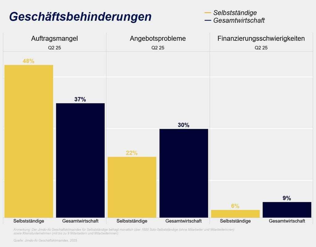 So ist aktuell fast jedes zweite Kleinstunternehmen im zweiten Quartal von Auftragsmangel betroffen (48,4 Prozent). Die fehlenden Aufträge stellen das größte Hindernis für die Selbstständigen dar (siehe Grafik) und nicht etwa wie bei den großen Firmen Finanzierungsschwierigkeiten oder Angebotsprobleme.