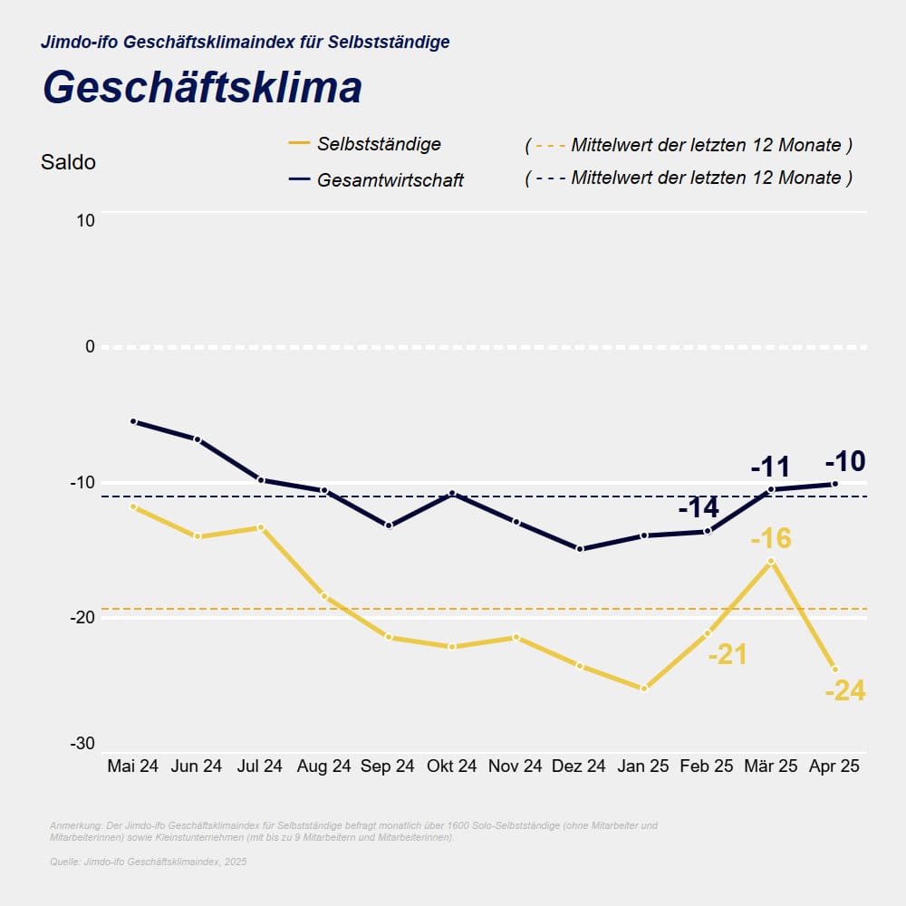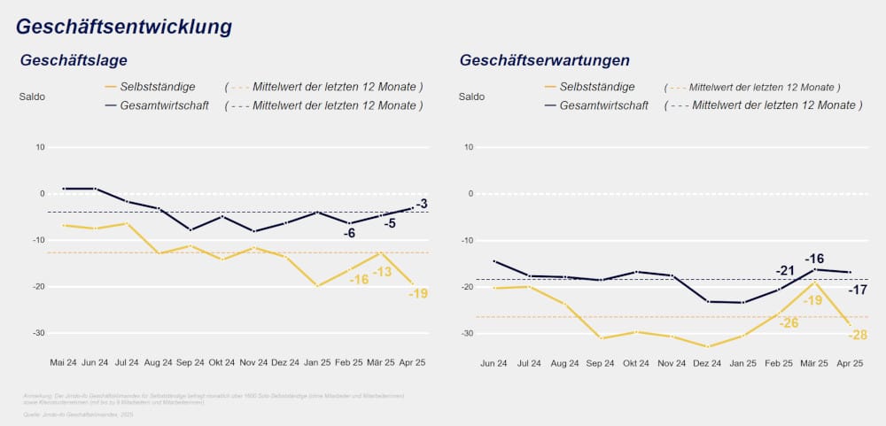 Der Index setzt sich aus der Einschätzung der aktuellen Geschäftslage und den Erwartungen für die kommenden Monate zusammen und zeigt, wie Soloselbstständige und Betriebe mit weniger als neun Mitarbeitern die derzeitige wirtschaftliche Entwicklung einschätzen. Hatten die kleinen Firmen in den vergangenen Monaten – nach einer langen Durststrecke – endlich wieder Optimismus gezeigt, so ist diese Phase im April 2025 erst einmal beendet. Sowohl die Geschäftslage, die bei -19,4 Punkten liegt (nach -12,7 im März 2025) als auch die Erwartungen für die kommenden Monate, die nur noch -28,1 Punkte erreichen (nach -18,9 im März 2025) zeigen deutlich, dass die wirtschaftliche Stimmung getrübt ist.