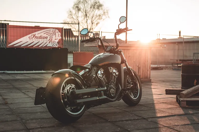Die Indian "Scout" mit Jekill und Hyde Auspuffanlage in der Abenddämmerung auf der Dachterrasse des Showrooms. - © Marcel Gollin
