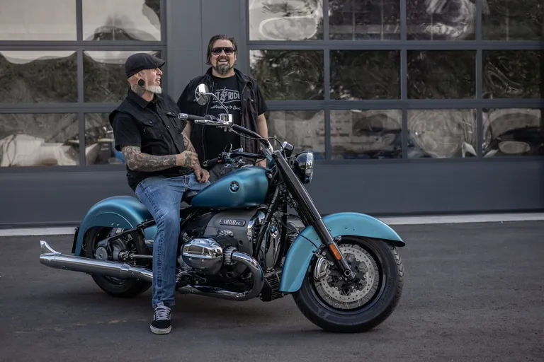Twist (auf dem Motorrad) und Inhaber Christian Ebert mit der angepassten BMW R18 "Saphire". - © Marcel Gollin